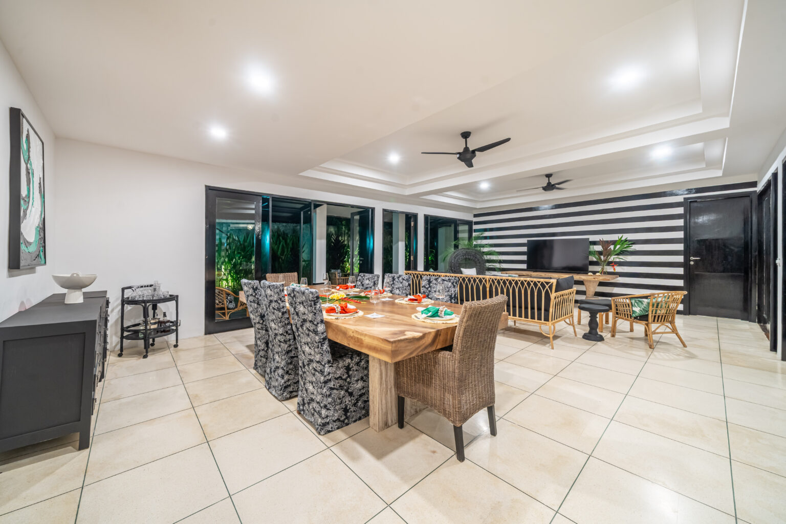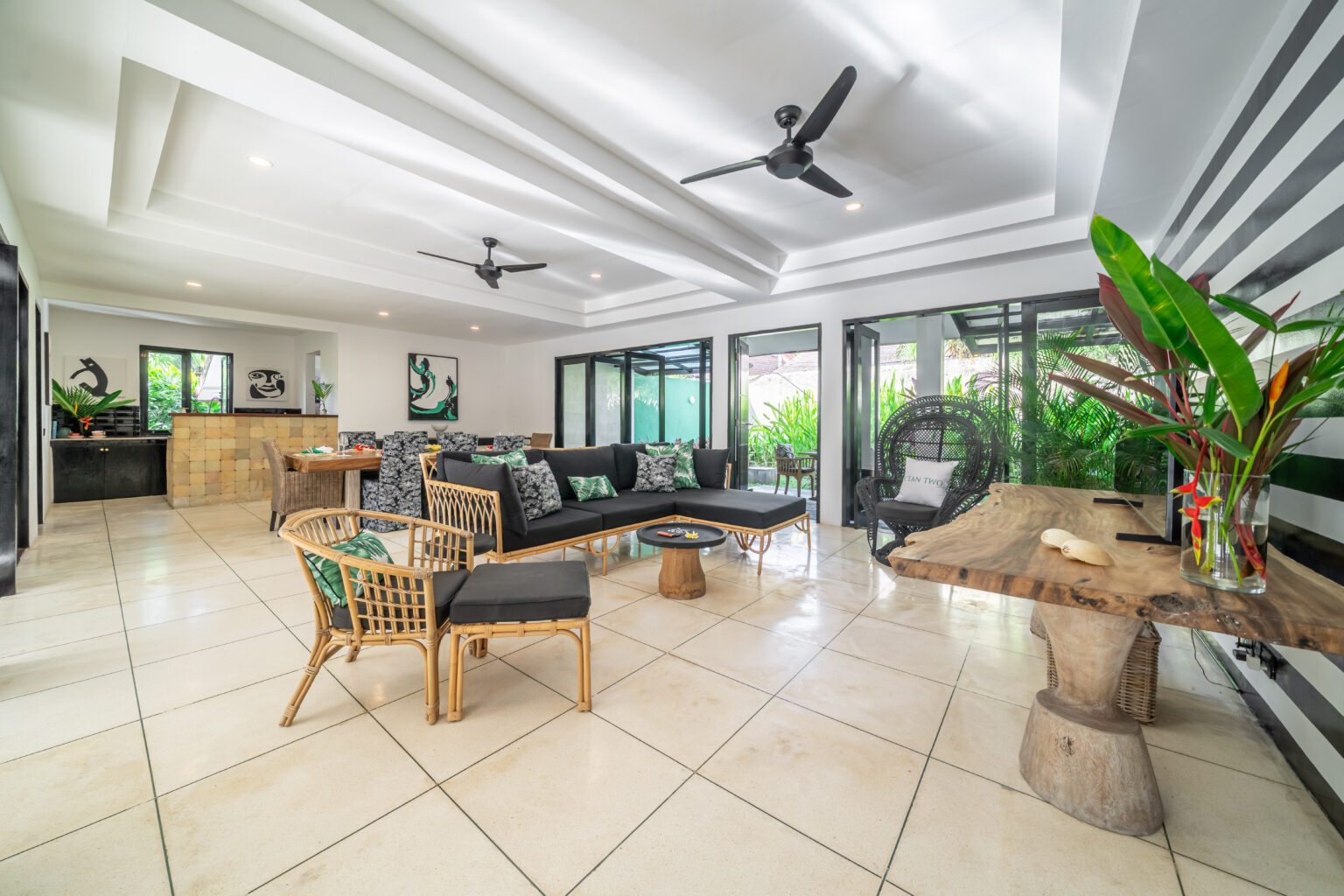 Inside, three generous bedrooms each feature their own ensuite for absolute comfort and privacy. The villa’s expansive open-plan living and dining areas flow effortlessly to the outdoors, giving everyone plenty of space to spread out—whether you’re lounging with a book, gathering for meals, or hosting sunset drinks.