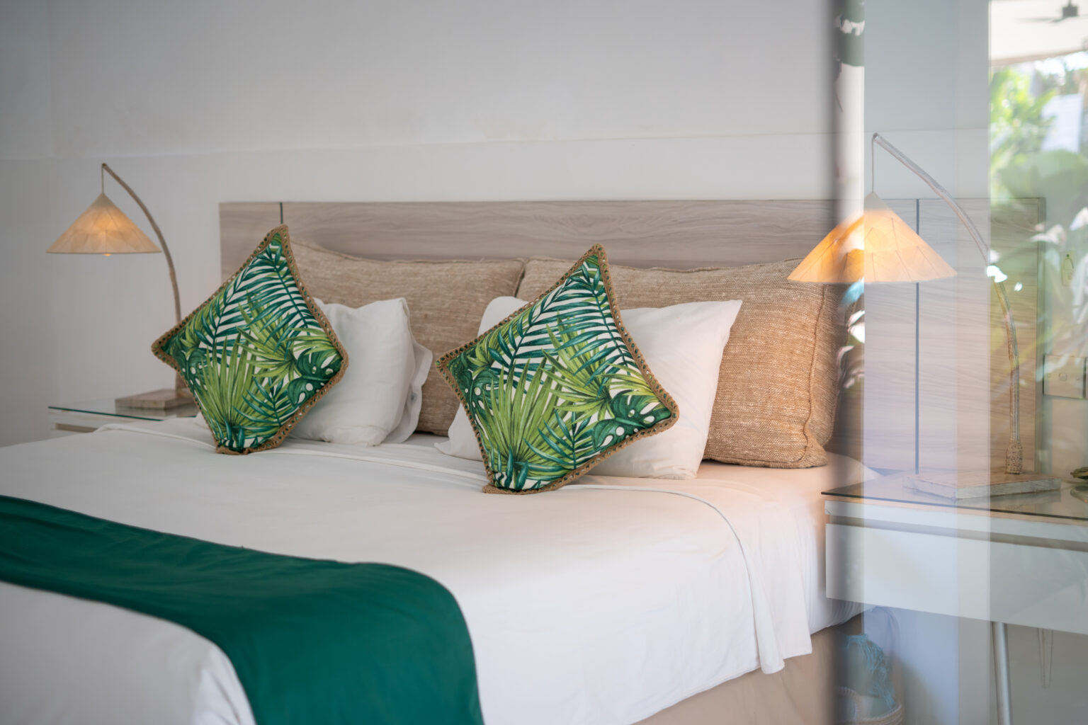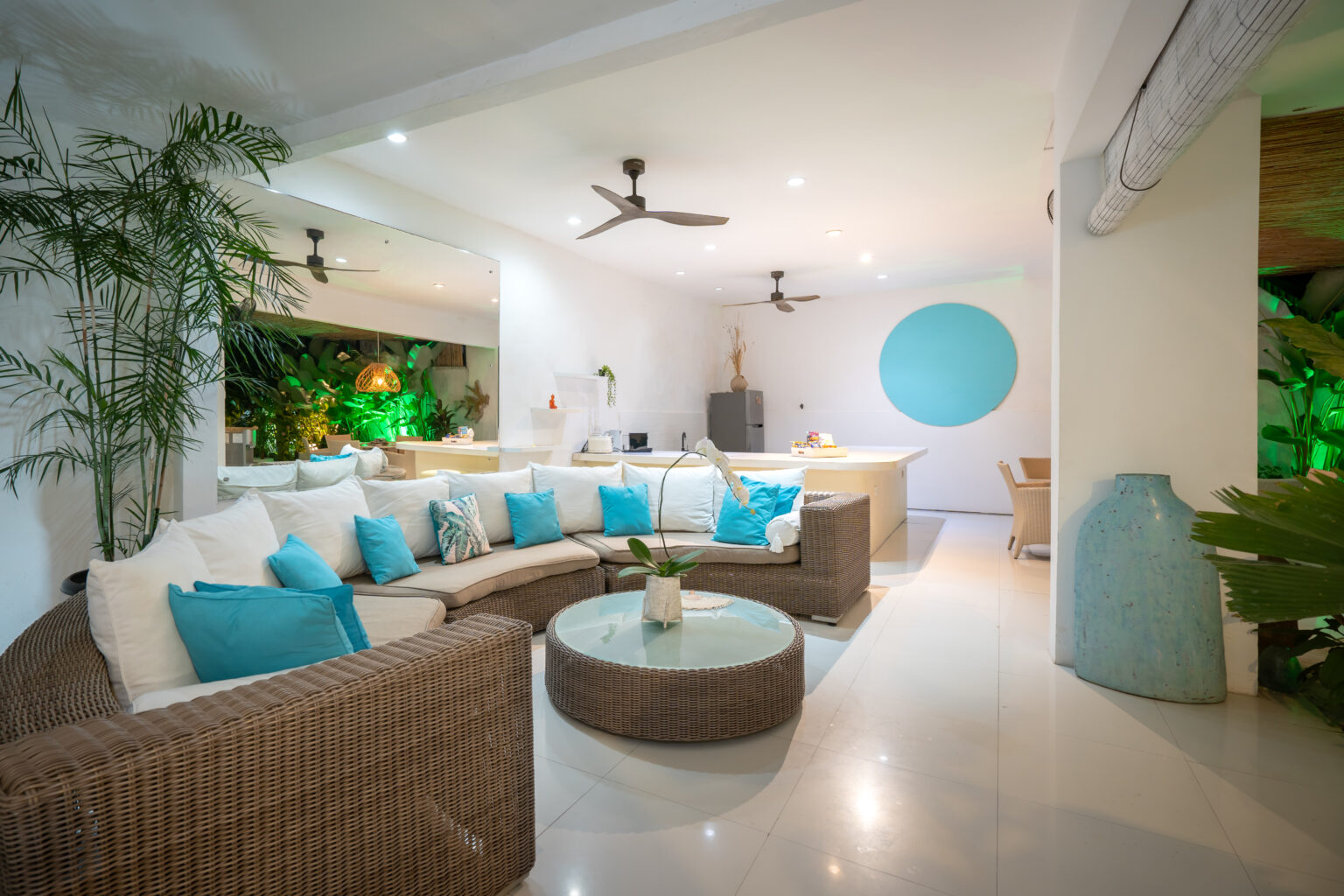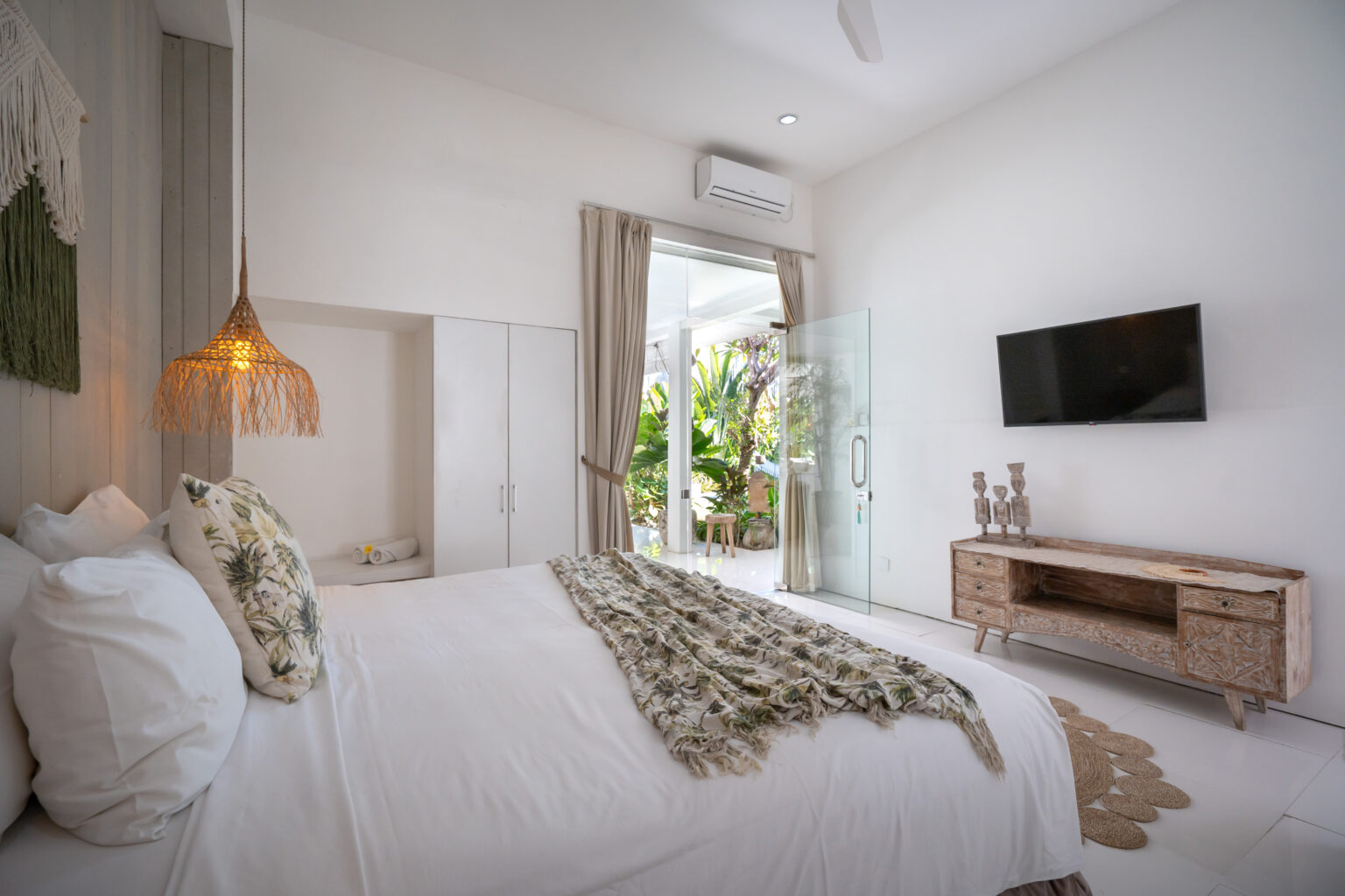 The spacious living area features a relaxed open layout cooled by a ceiling fan, creating a natural flow between indoor and outdoor spaces. Each bedroom is air-conditioned and designed for restful comfort, featuring soft tones, warm lighting, and a calm tropical ambiance.