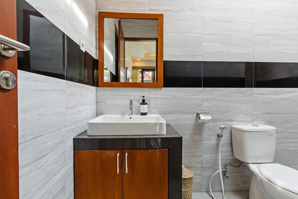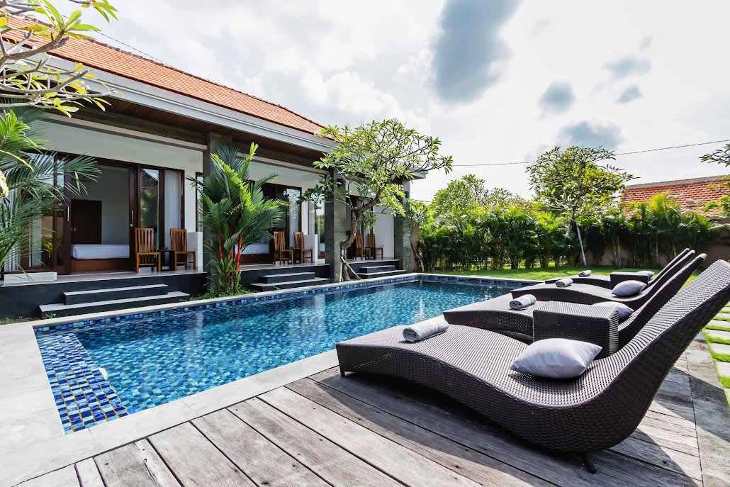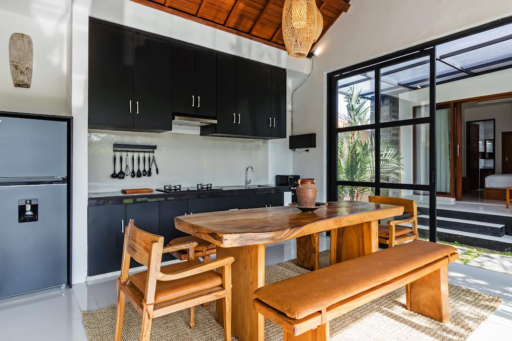Each bedroom features its own elegant ensuite, ensuring privacy and indulgence for every guest. Inside, the villa’s air-conditioned living and dining area provide a cool and inviting space to unwind, while large glass doors open to a lush tropical garden and a sparkling private pool — perfect for enjoying Bali’s warmth in total comfort.