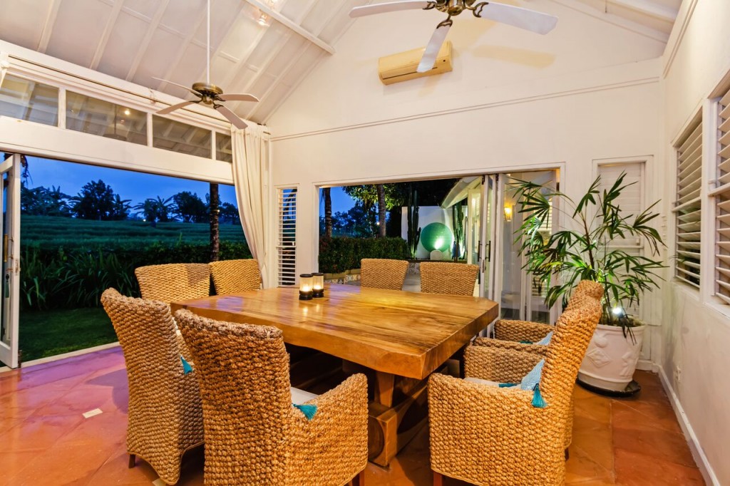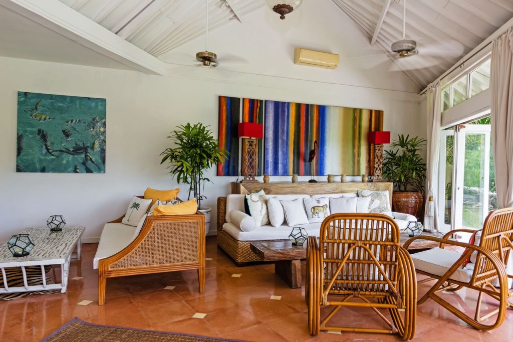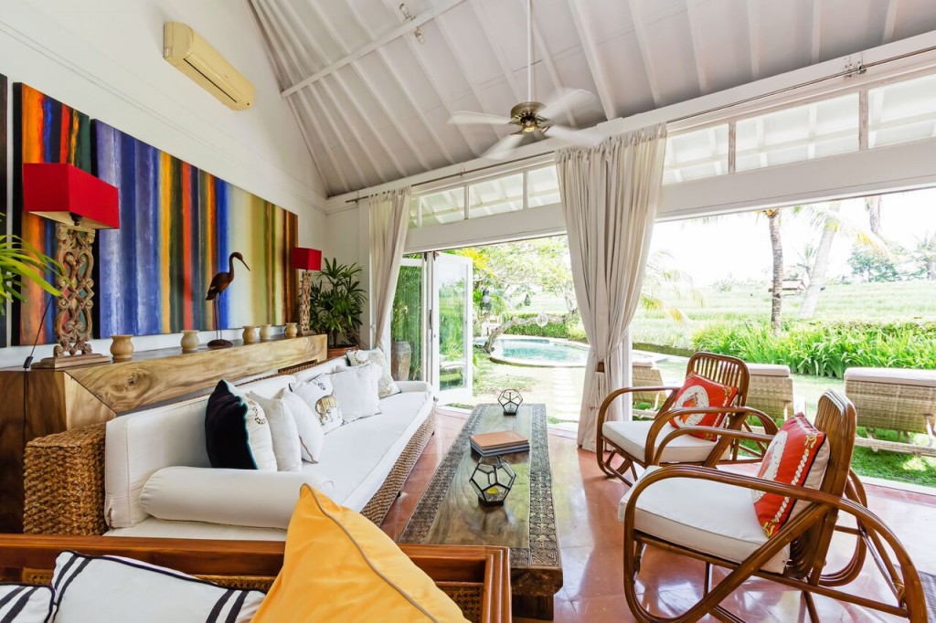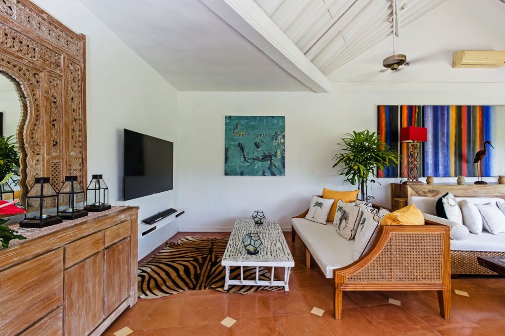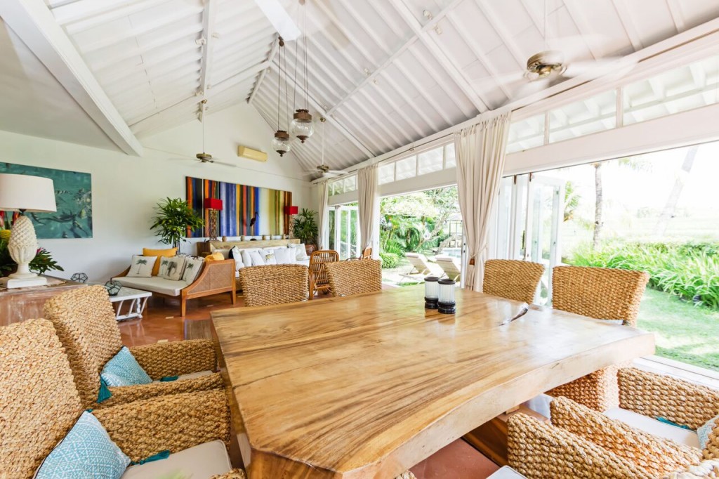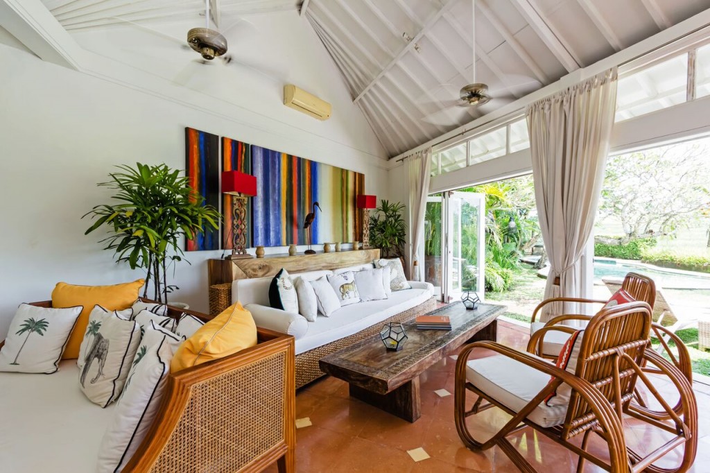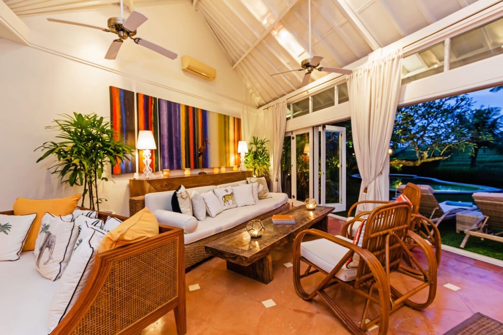 The enclosed air-conditioned living area is designed for comfort and calm, featuring soft tones, rattan textures, and vibrant décor that create a warm and inviting atmosphere. It’s the perfect spot to unwind with loved ones after a day exploring Canggu.