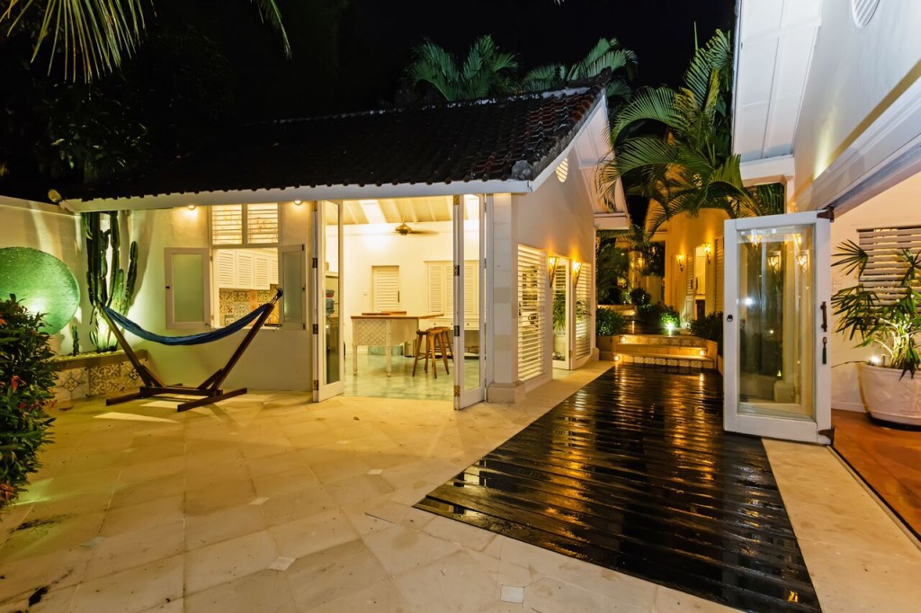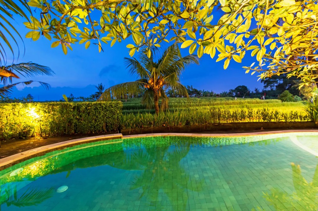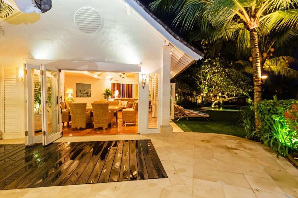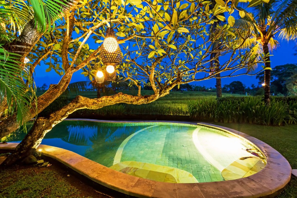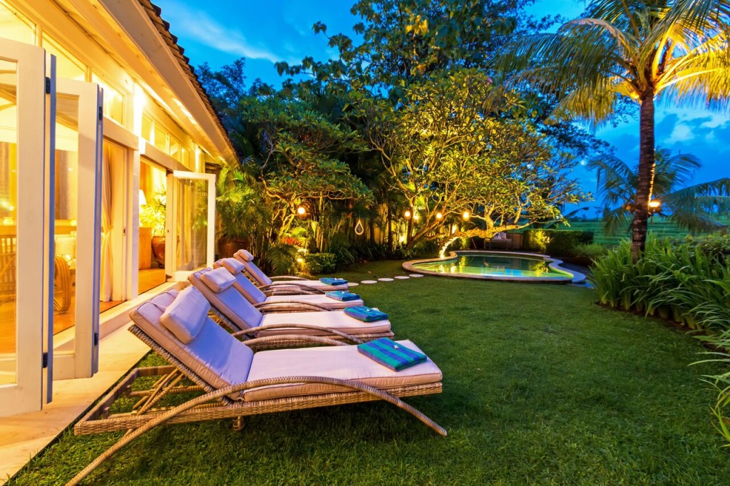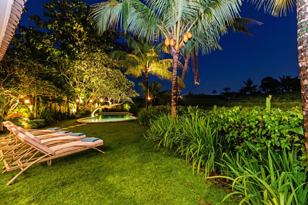 Outside, manicured gardens and an elegant oval-shaped pool offer a peaceful space to soak up the sun. As night falls, gentle garden lighting transforms the setting into a dreamy, intimate retreat.