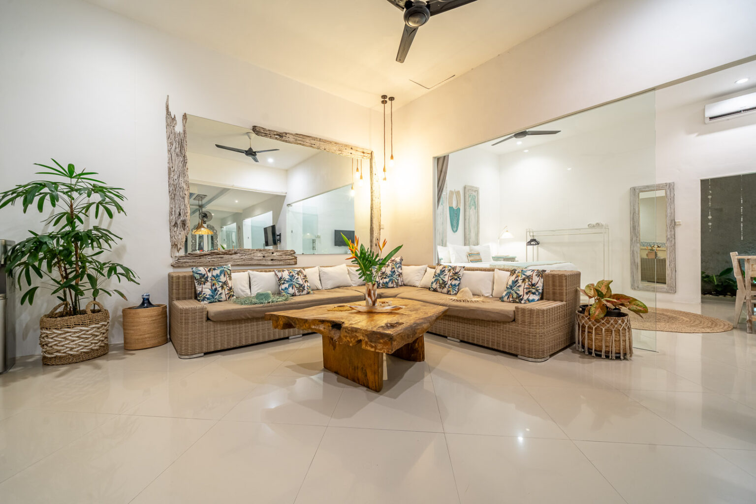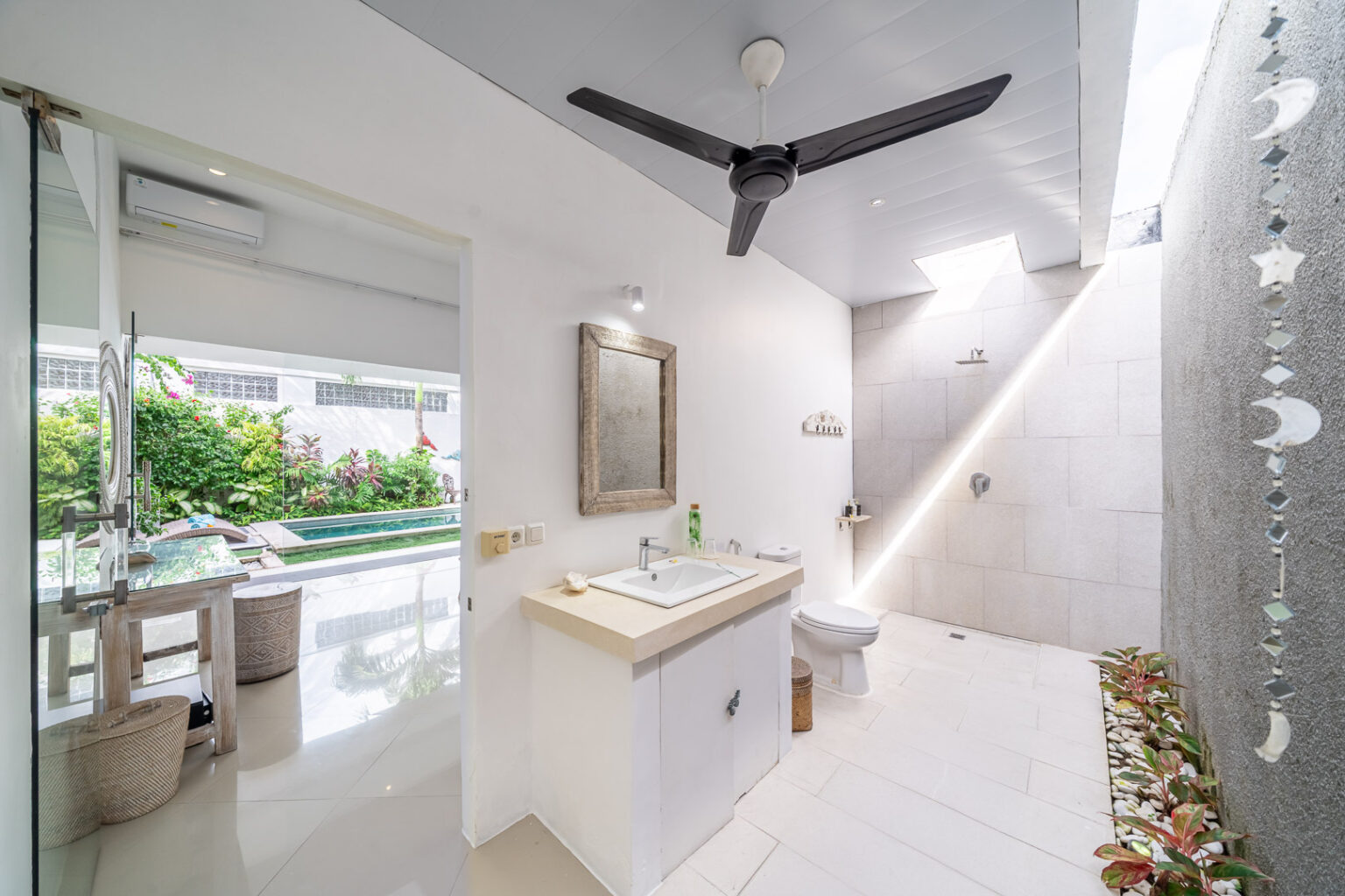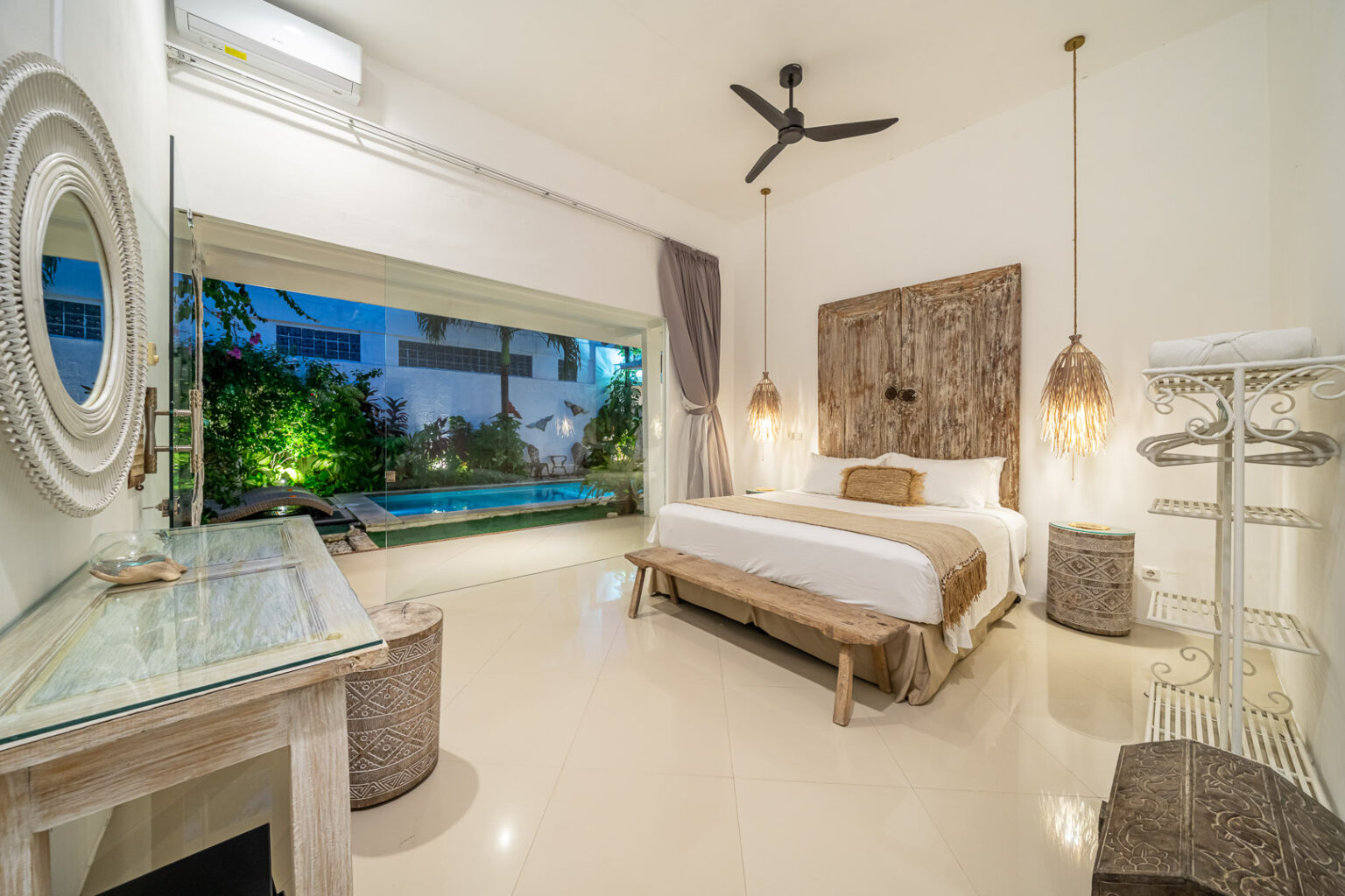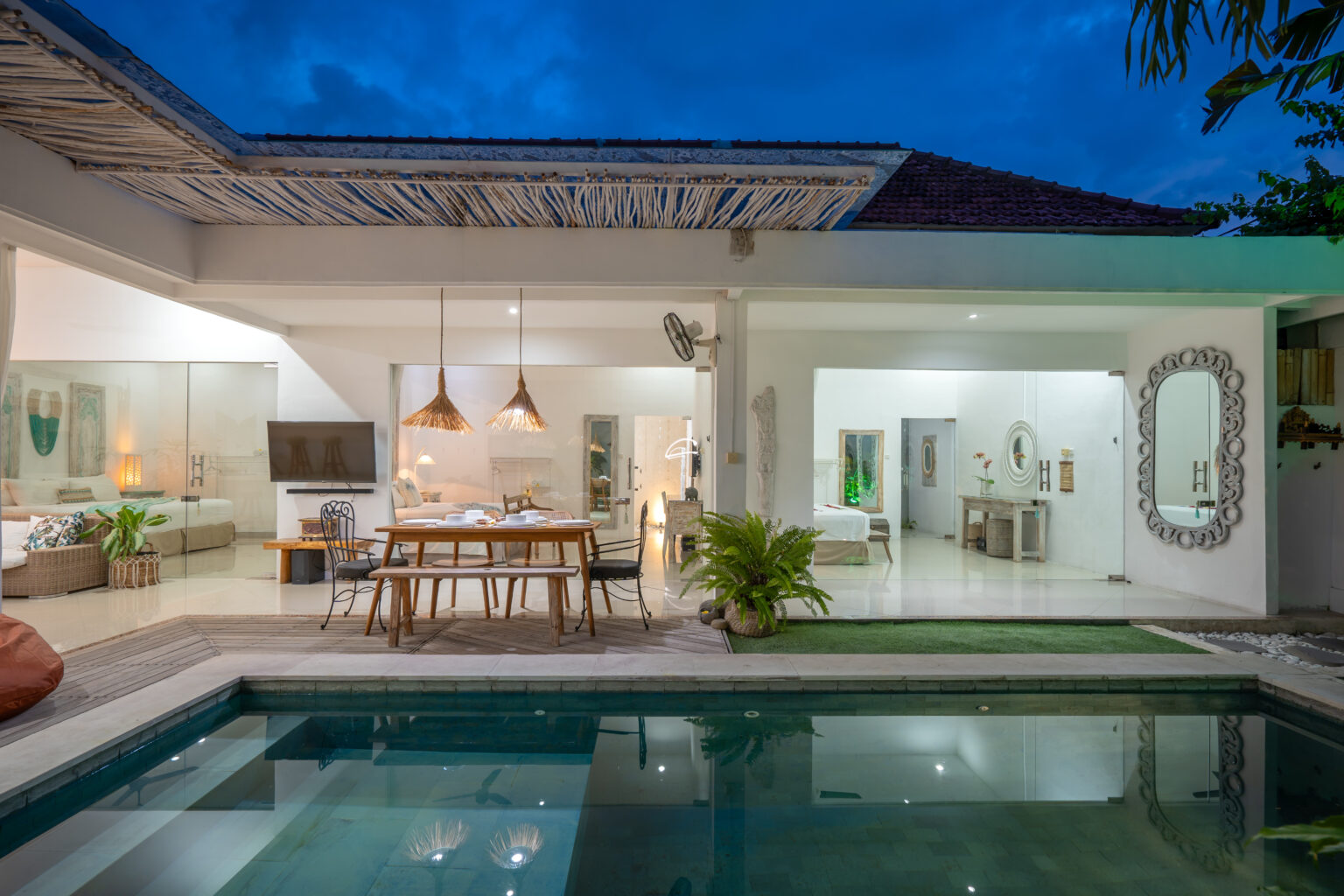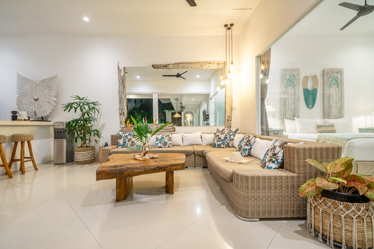 The open-plan living area, cooled by ceiling fans, invites you to unwind and enjoy Bali’s gentle breeze. Each bedroom is tastefully styled with calming tones, rustic wooden accents, and soft lighting — creating a cozy and elegant space where comfort takes center stage. Large sliding doors open directly to the pool, filling the villa with natural light and connecting you effortlessly to the outdoors.