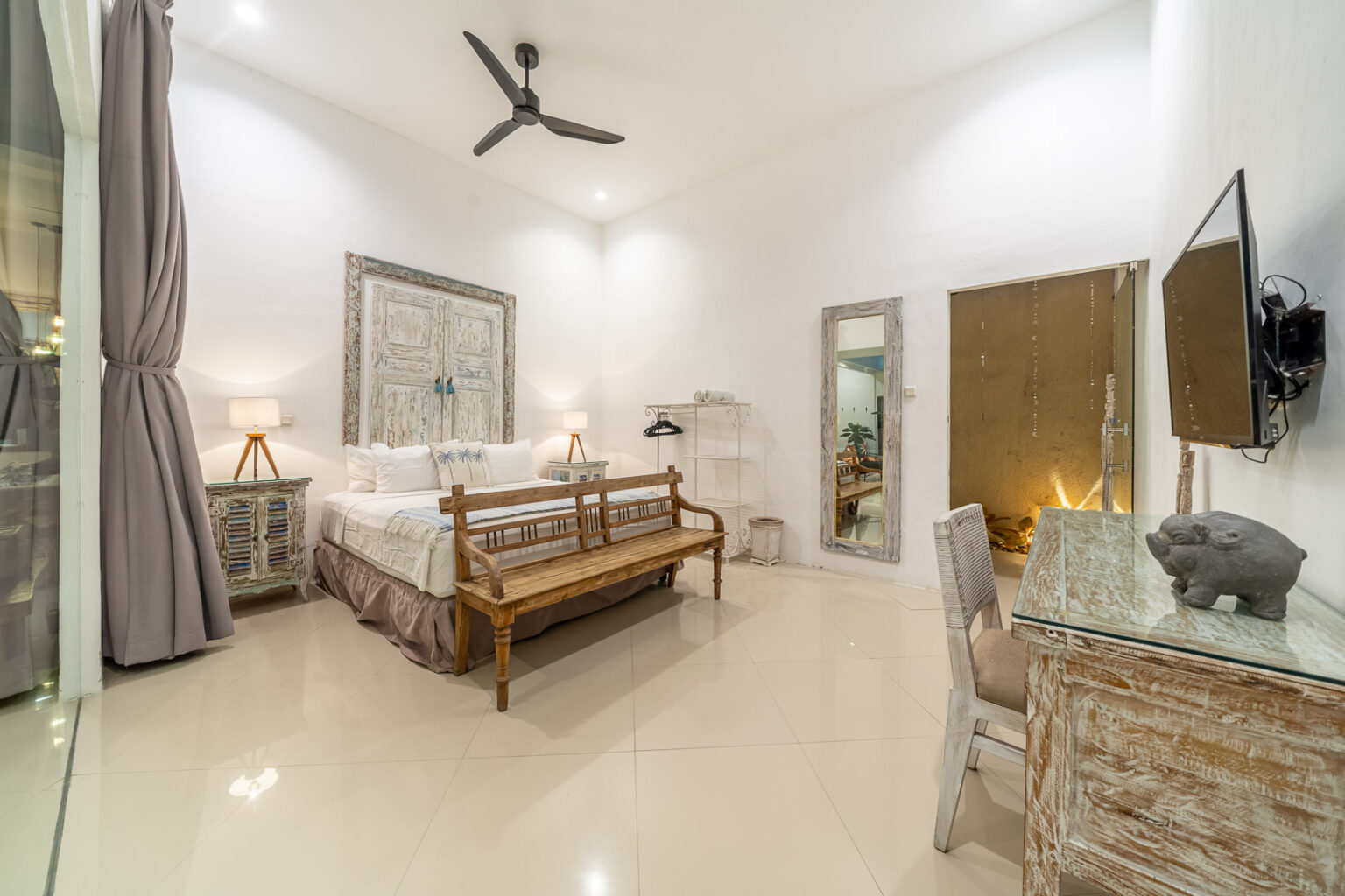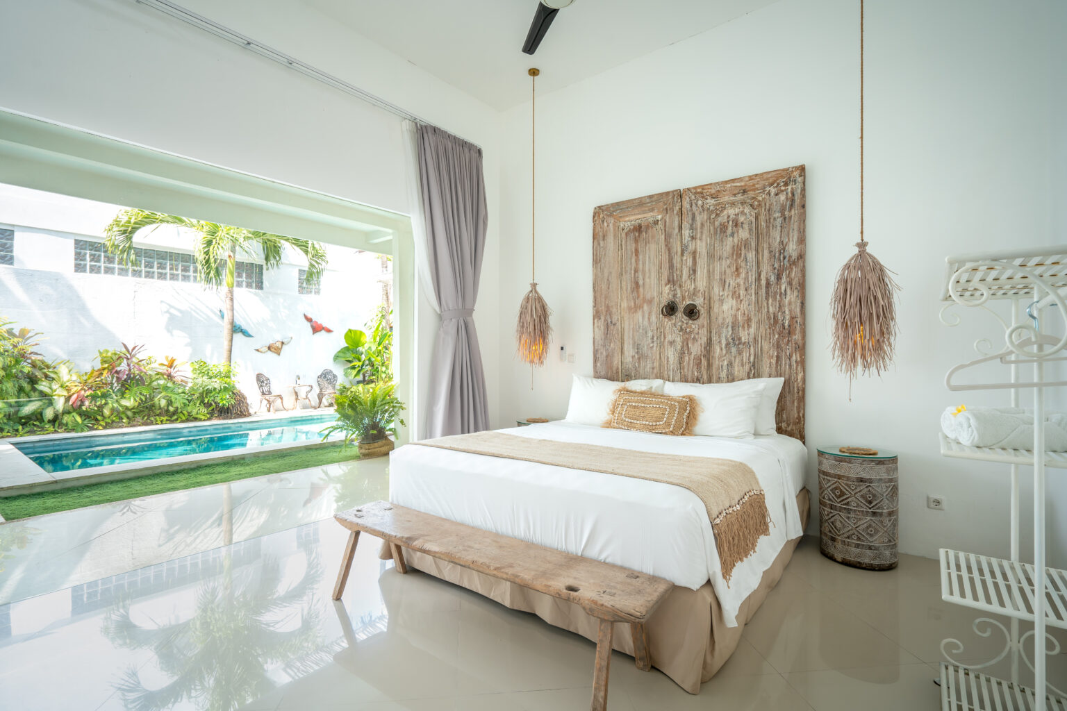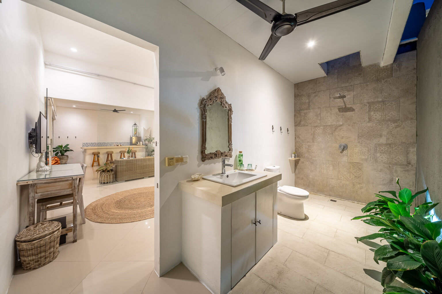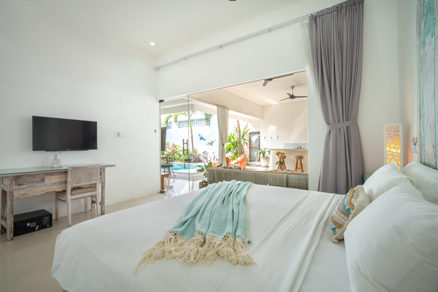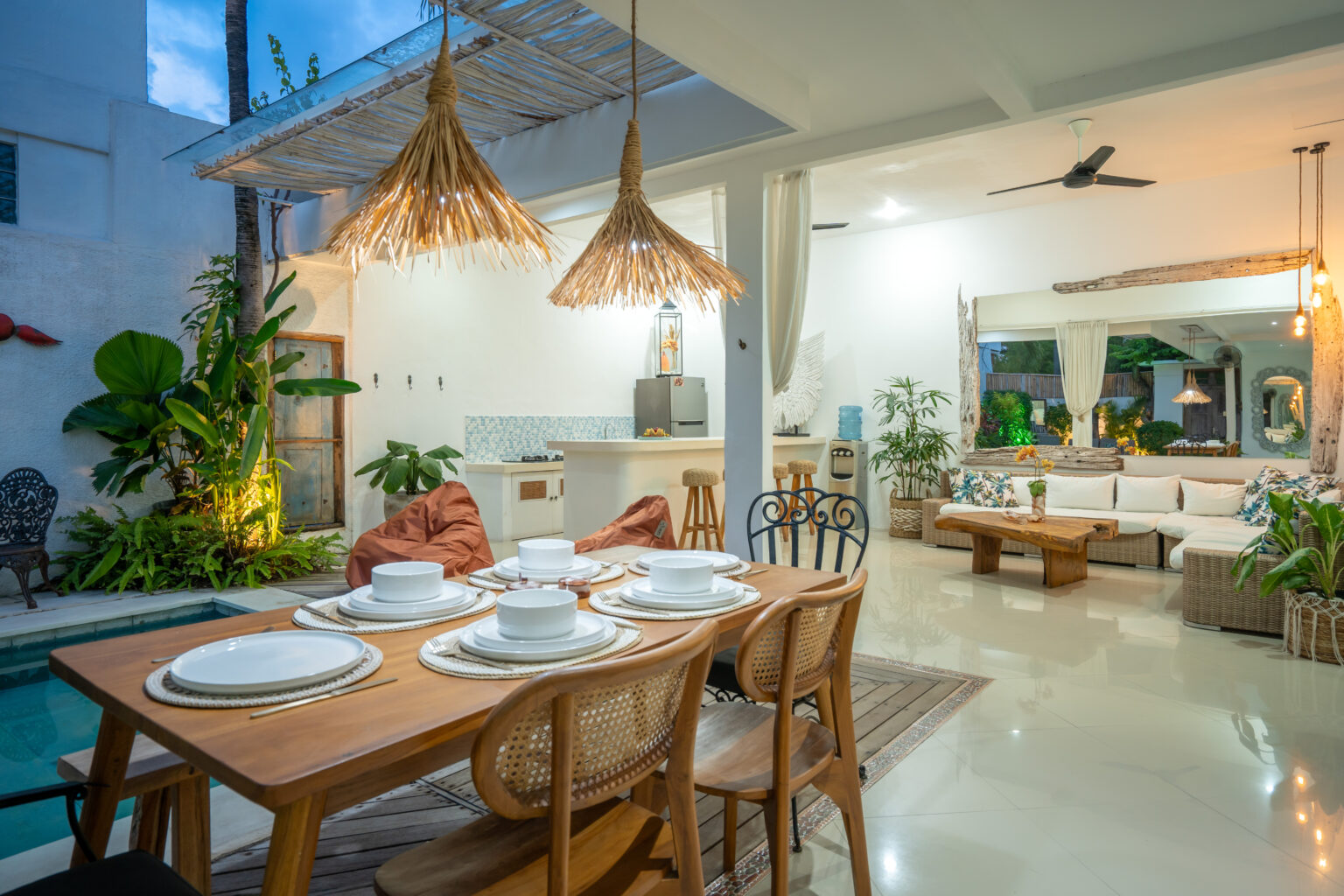 The open-plan living area, cooled by ceiling fans, invites you to unwind and enjoy Bali’s gentle breeze. Each bedroom is tastefully styled with calming tones, rustic wooden accents, and soft lighting — creating a cozy and elegant space where comfort takes center stage. Large sliding doors open directly to the pool, filling the villa with natural light and connecting you effortlessly to the outdoors.