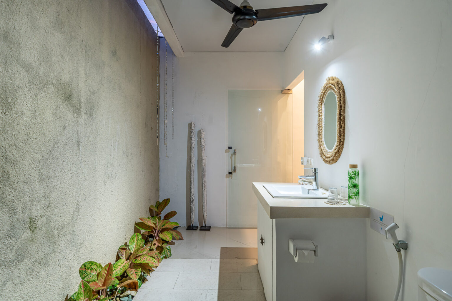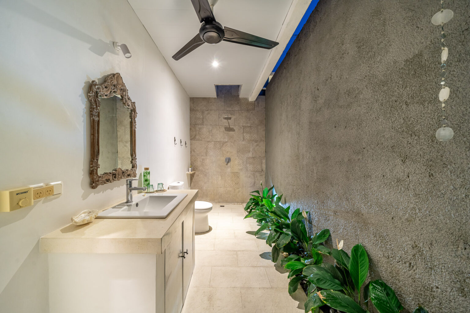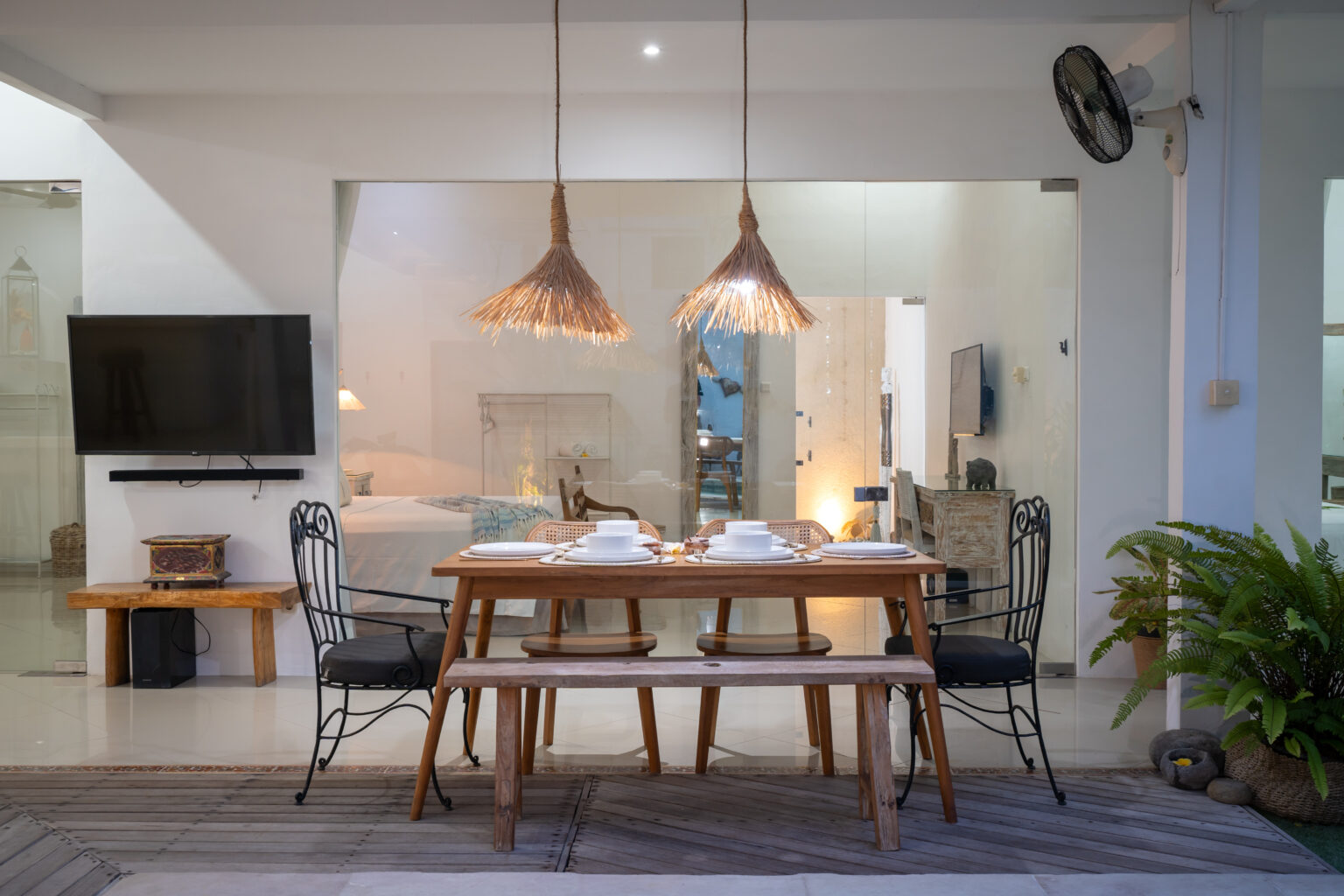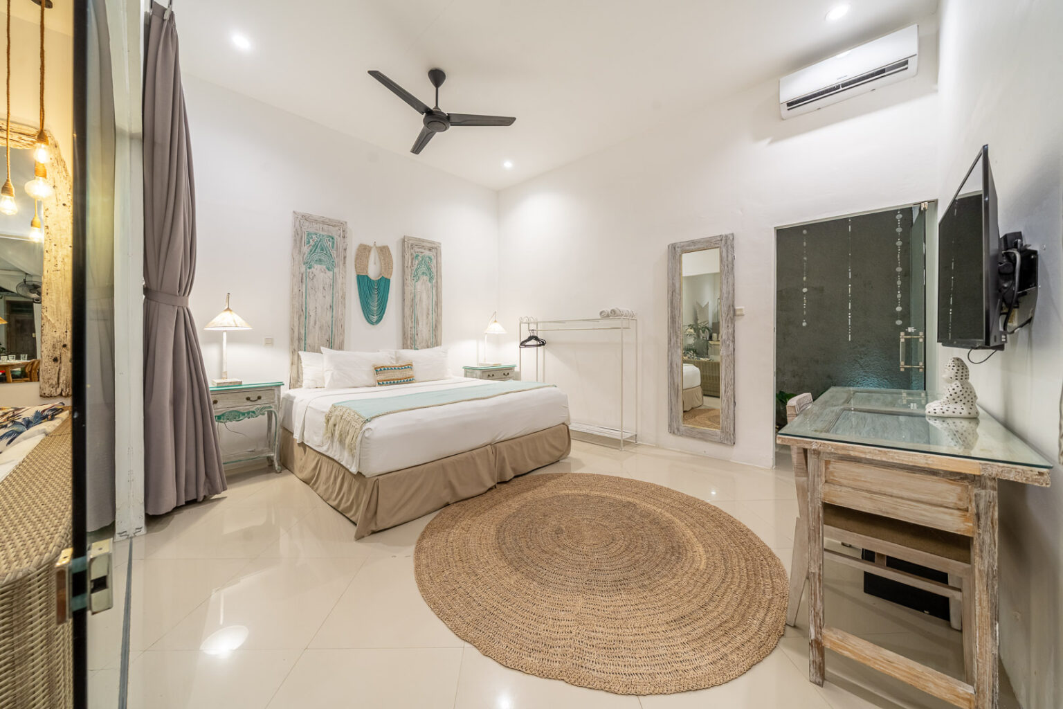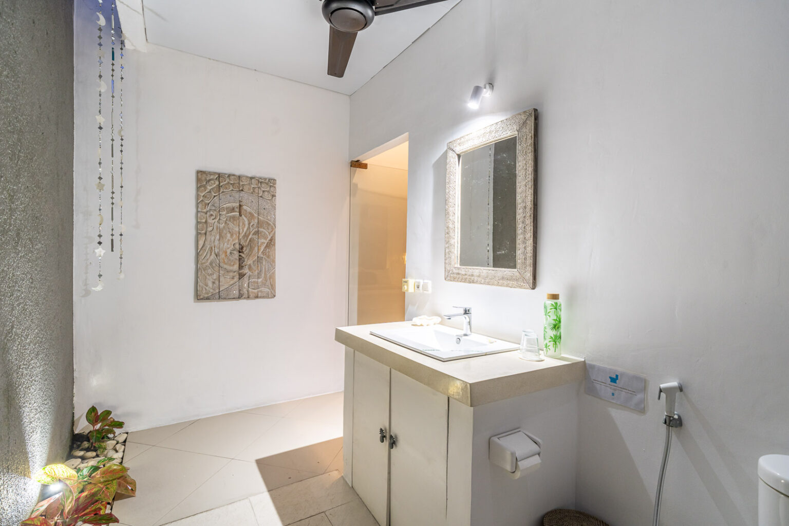 The open-plan living area, cooled by ceiling fans, invites you to unwind and enjoy Bali’s gentle breeze. Each bedroom is tastefully styled with calming tones, rustic wooden accents, and soft lighting — creating a cozy and elegant space where comfort takes center stage. Large sliding doors open directly to the pool, filling the villa with natural light and connecting you effortlessly to the outdoors.