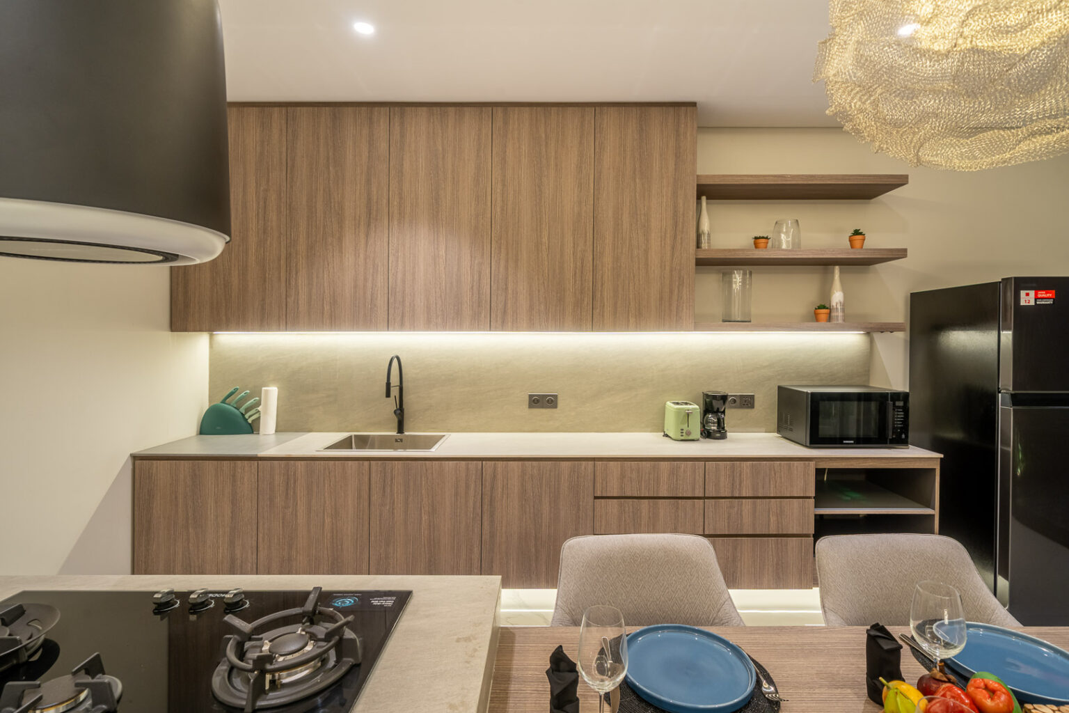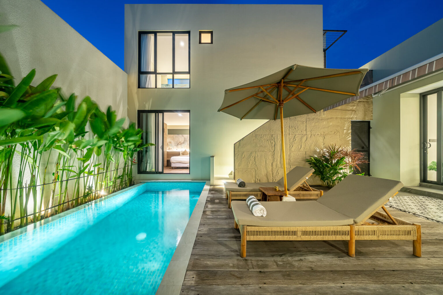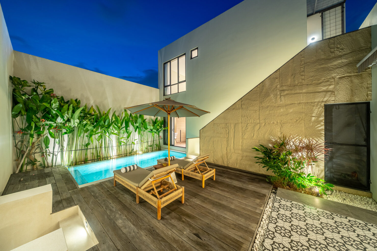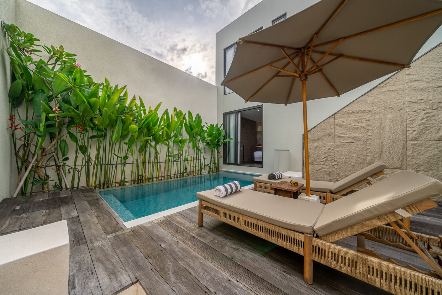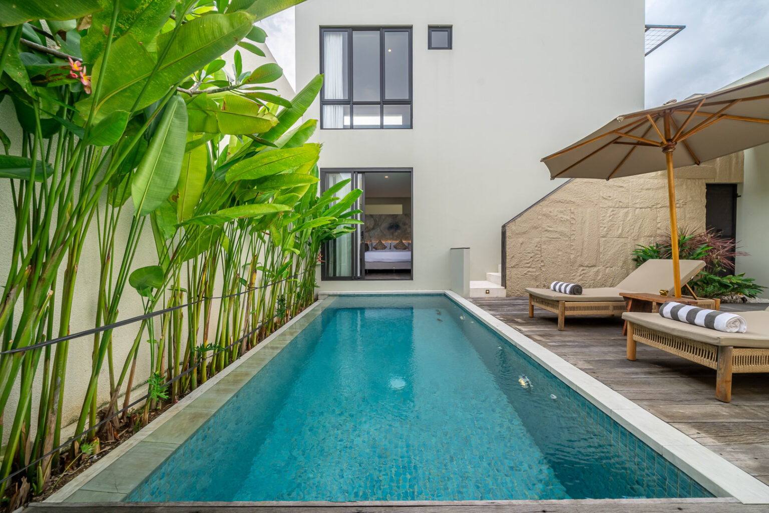 Enjoy the inviting living area with air conditioning, offering a cool and comfortable space to relax or gather after a day exploring. Each bedroom features modern décor and an ensuite bathroom, while the private pool is ideal for refreshing dips under the tropical sun.